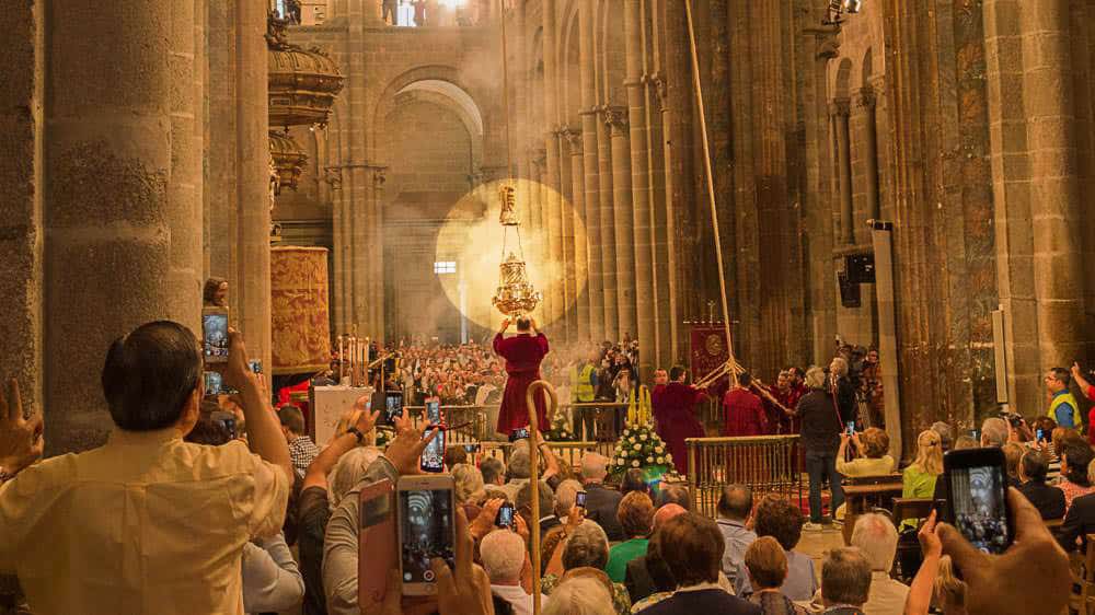 Es ist sehr wahrscheinlich, dass am Jakobstag, dem 25. Juli (hier im Jahr 2016) der Botafumeiro in der Kathedrale von Santiago geschwenkt wird.