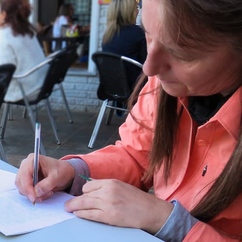 Beate Steger schreibt Tagebuch auf dem Camino Finisterre, in Negreira, auf dem Jakobsweg.