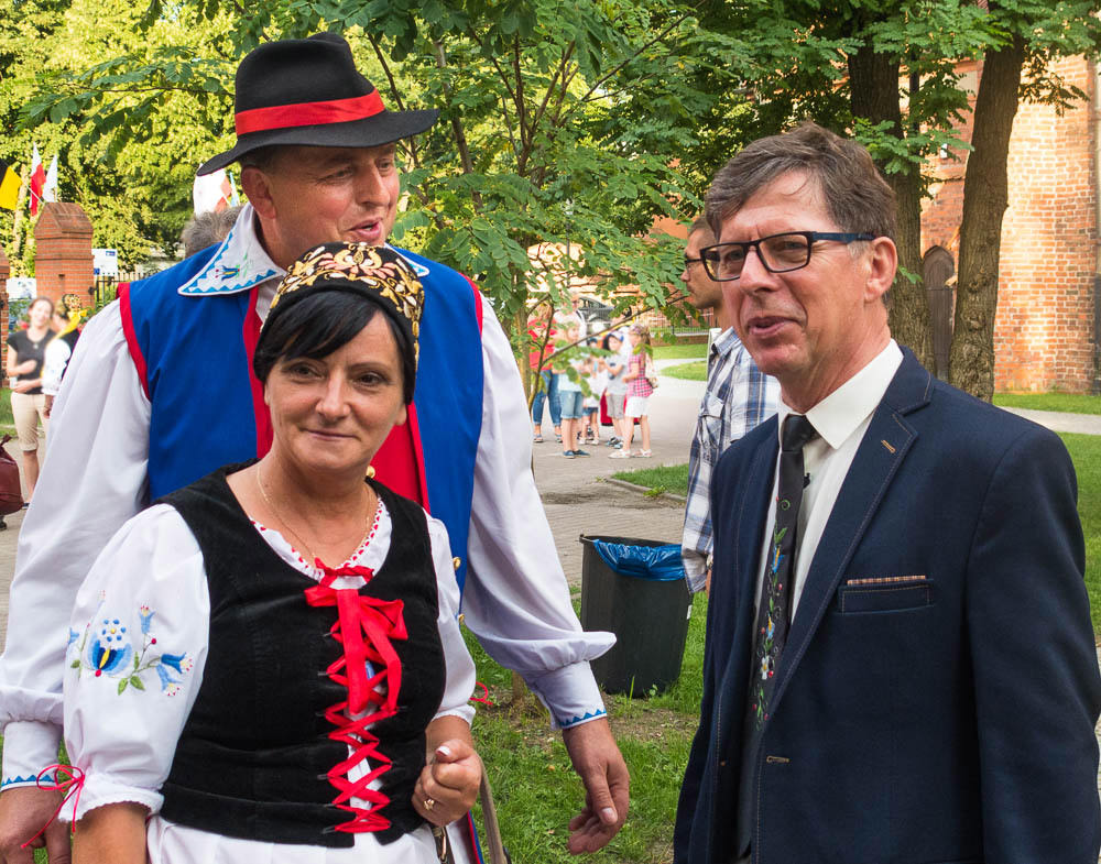 Ryszard Wenta (rechts), der Kurator des pommerschen Jakobswegs, mit zwei Polen in kaschubischer Tracht
